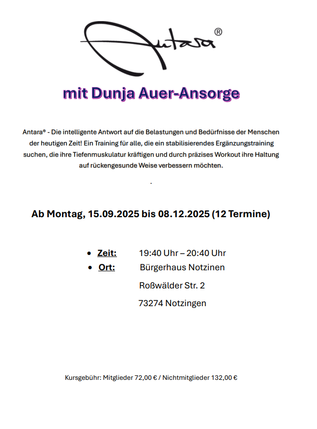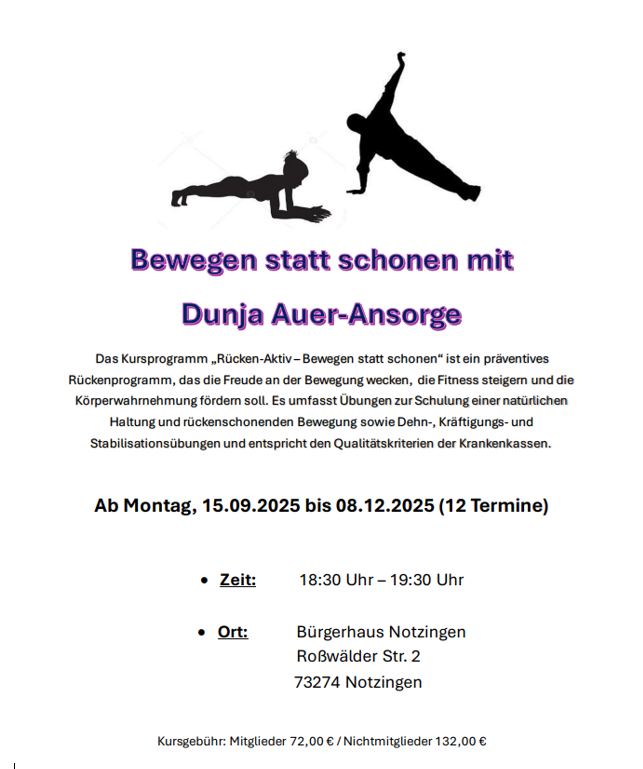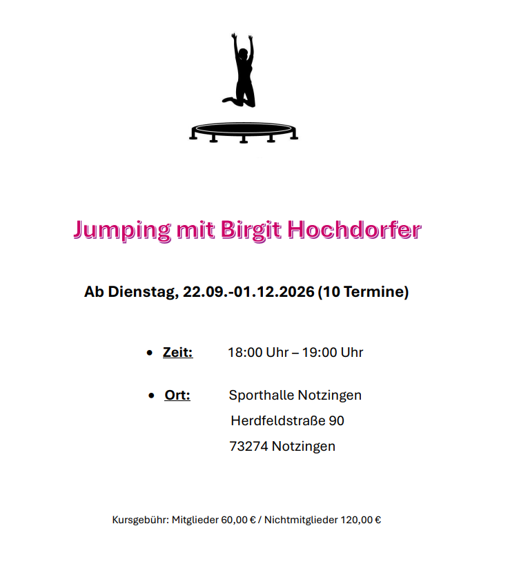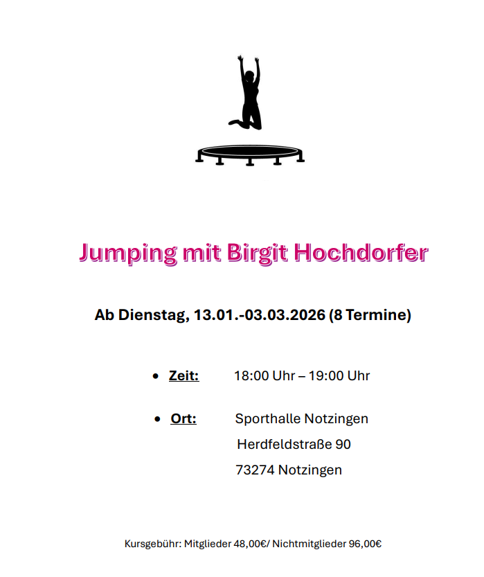 Seit 2018 besteht eine Vereinskooperation der Vereine TSV Schlierbach, TSV Notzingen, TSV Ohmden und TSV Jesingen. Alle Vereinsmitglieder können sämtliche Kurse der Kooperationsvereine zu Mitglieder-konditionen buchen. Die Mitgliedschaft in einem der Vereine reicht aus. Die Vorteile der TSV-Notzingen-Mitglieder liegen auf der Hand. Die Mitglieder erhalten die Möglichkeit, zusätzlich zu den TSVN-Angeboten wie Funktionelle Fitness und Jumping-Fitness, Bewegen statt Schonen usw., weitere Gesundheitskurse zu belegen. Die Kooperation bietet Kurse wie Cross-Body-fit, Rückenfit, Zumba, Yoga, Bewegung für Babys und vieles mehr an. Melden Sie sich an und nutzen Sie dieses vielfältige Angebot für Ihre Gesundheit!